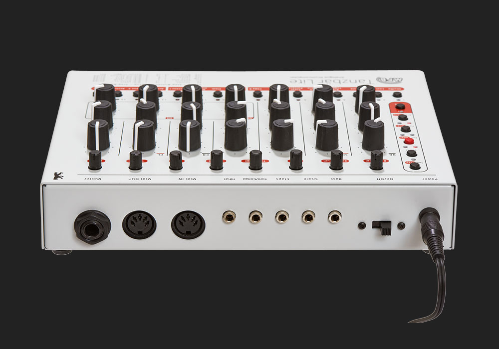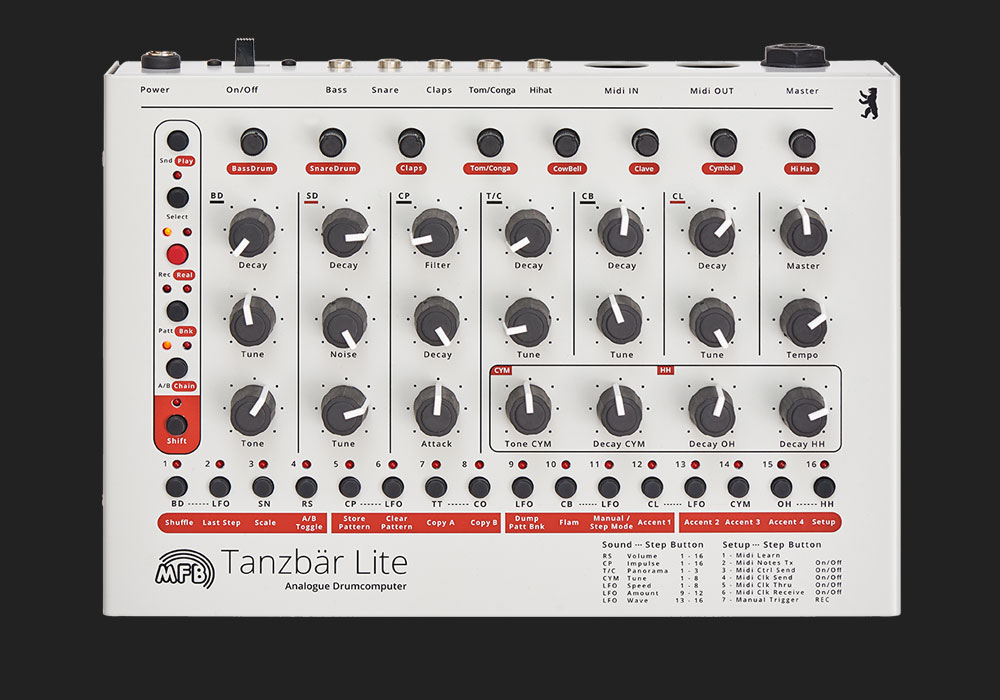 Description | The TANZBÄR LITE drumcomputer is a further development of our MFB 522. He offers nine powerful analogue percussion instruments. A chase sequencer stores up to 64 patterns. You can chain up to 16 different patterns, A/B let you switch or alternate between A and B. Moreover you can program up to 16 different Flam algorithm. Step lenght is individual selectable for each instrument - polyrhythms are easy to get. 32 steps, 16th or 16th/8th triplets are the basic metrics and a 15 different shuffles can be set globally. Four different accents are available. Five independed LFOs can be used to modulate the pitch of Bassdrum, Claps, Tom/Conga, Cowbell and Clave. They offers four waveforms and can be programmed independly for each step. The compact chassis is built from steel plate. All Soundparameter can be recorded in step- or realtime mode. The sequencer sends Midi notes and can trigger other soundsources. TANZBÄR LITE send and get Midi Clock. Beside Master Volume each instrument has its own volume pot and mute function. You have five individual outs and one stereo out, Claps are in stereo. The compact chassis is built from steel plate. TANZBÄR LITE has the following dimensions: 200x140x40mm. An external power supply is included. Instruments Parameters Bassdrum : Decay Time, Tune, Attack Level, LFO Snare: Tune, Noise Level, Noise Decay Rimshot: Level Claps: Filter, Reverb Decay Time, Intensity, Number and Patterns of Attacks, LFO Tom/Conga: Decay Time, Tune, Panning, LFO Cowbell: Decay Time, Tune, LFO Claves: Decay Time, Tune, LFO Cymbal: Decay Time, Tune, Blend Ping/Cymbal Open Hihat: Decay Time, Tune Closed Hihat: Decay Time, Tune The Prize of TANZBÄR LITE is 430 Euro |
